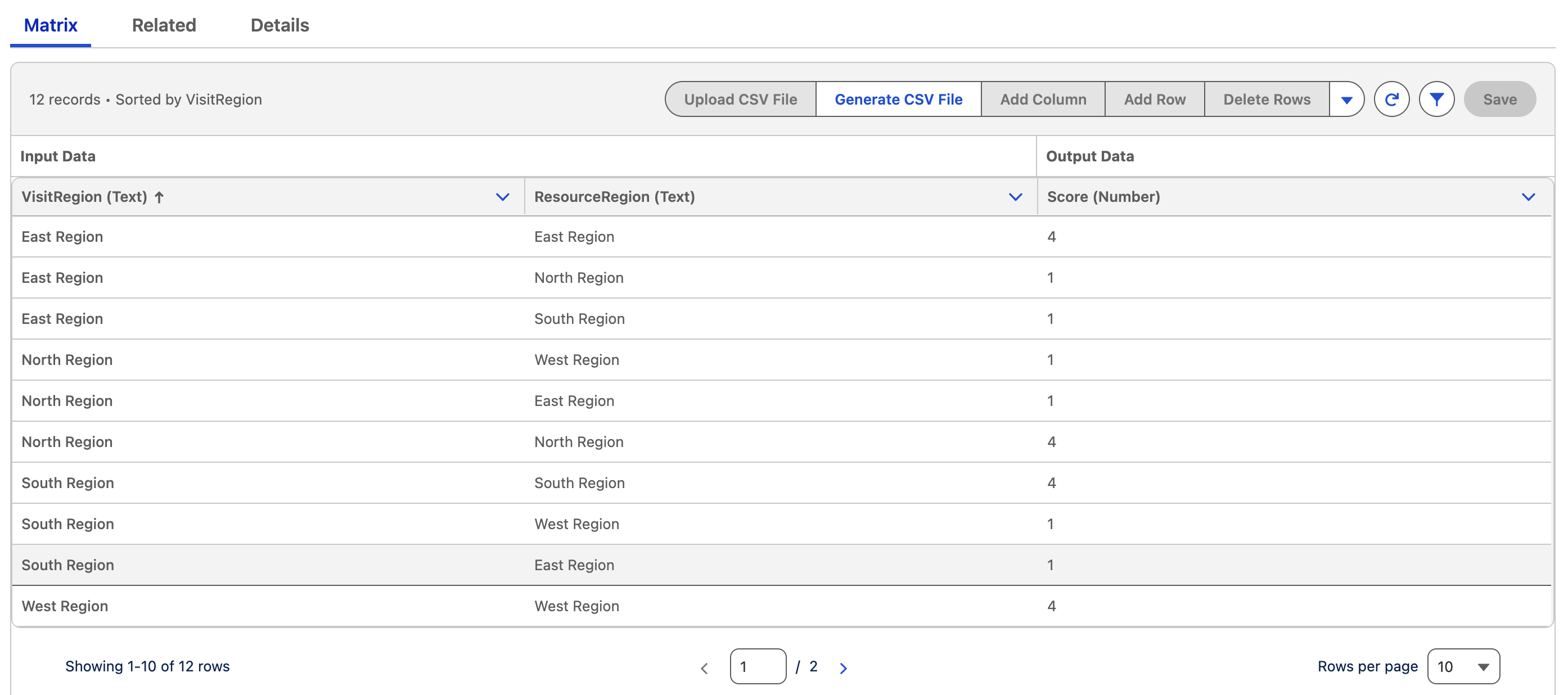 Example BRE Decision Matrix that outputs a fit-score based on Visit and Resource geographic regions
