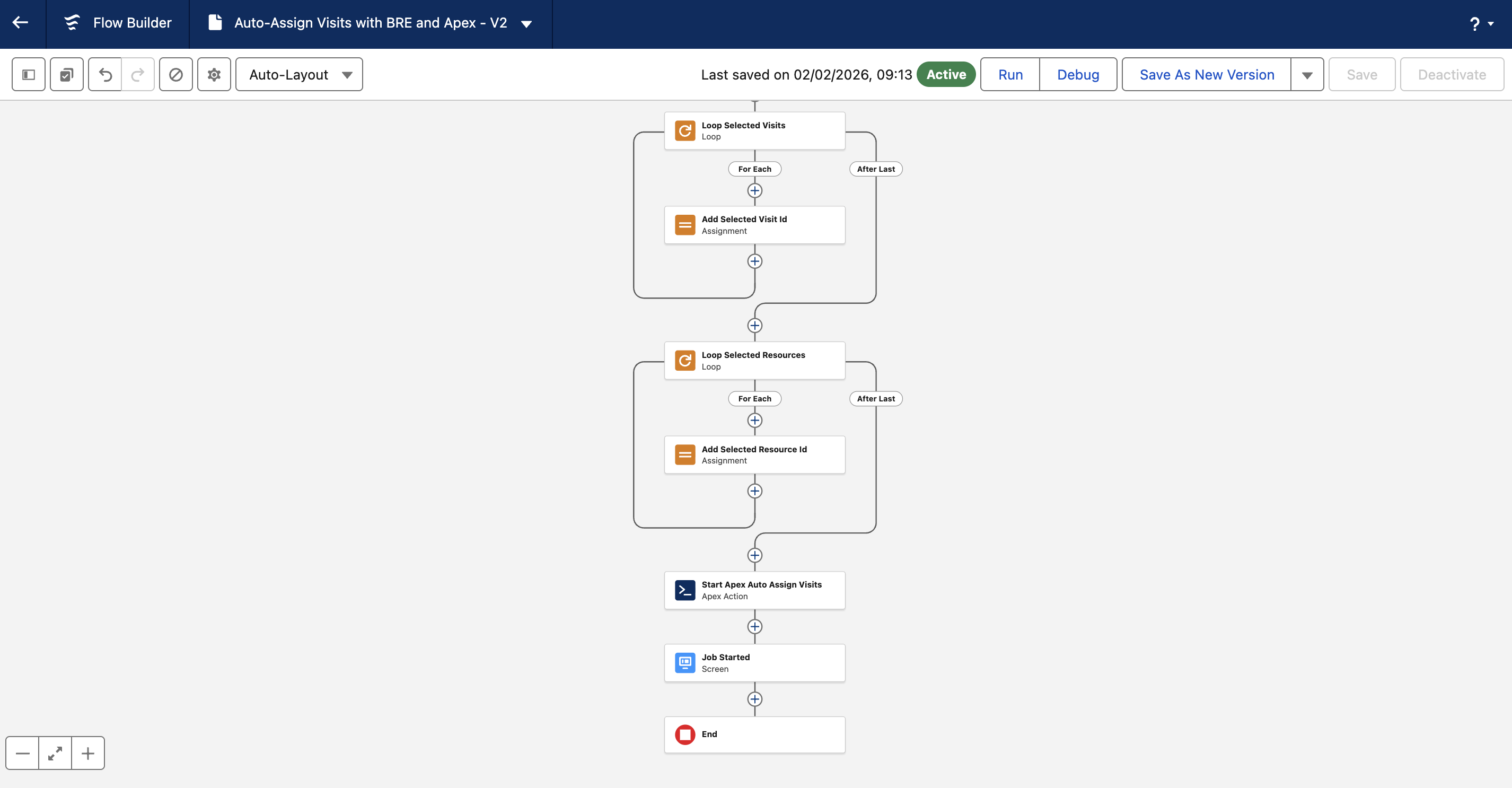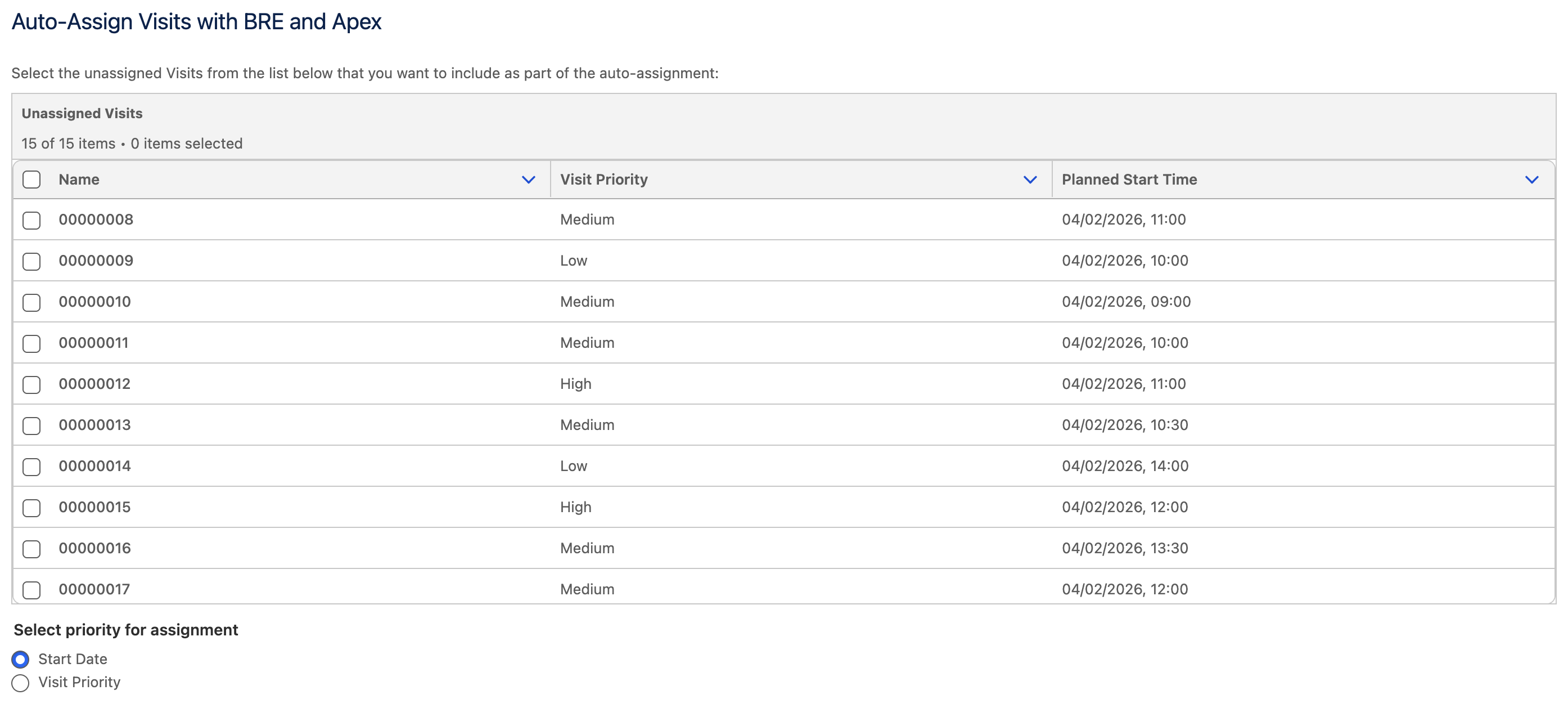 Example Screen Flow that allows a user to select which Visits to include in the automation and how to prioritise their assignment